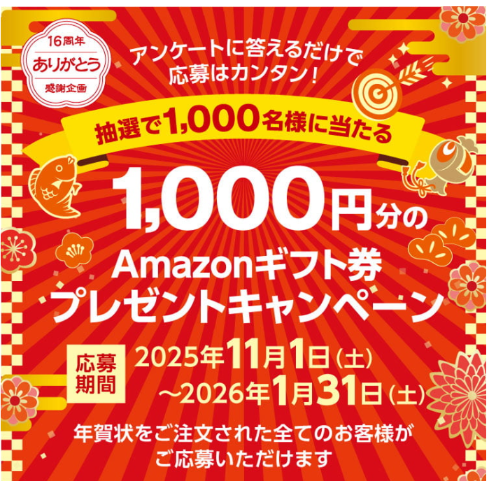 16周年ありがとう感謝企画として、アンケートに答えるだけで応募できるAmazonギフト券プレゼントキャンペーンを今年は実施します。